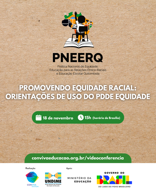 Nesta terça-feira, 18 de novembro, a Undime, por meio do Conviva Educação, e em parceria com o Ministério da Educação (MEC) realizará videoconferência para falar sobre equidade racial, trazer orientações de uso do PDDE Equidade, sobre quando e como o recurso pode ser utilizado, além de apresentar sugestões de cursos disponíveis no Avamec relacionados à temática.