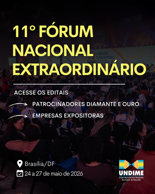 A União Nacional dos Dirigentes Municipais de Educação (Undime) torna público os editais para seleção de patrocinadores masters e de empresas expositoras para o 11º Fórum Nacional Extraordinário dos Dirigentes Municipais de Educação (11FNEx).