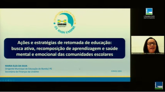 A Undime participou, nesta quinta-feira (23), de audiência pública virtual da Câmara dos Deputados para tratar sobre ações e estratégias de retomada da educação: busca ativa, recomposição de aprendizagem e saúde mental e emocional das comunidades escolares, representada pela Dirigente Municipal de Educação de Bonito/ PE e secretária de Finanças da Undime, Maria Elza Silva.
