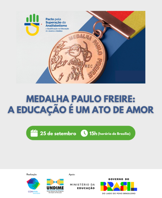 Nesta quinta-feira, 25 de setembro, às 15h (horário de Brasília), a Undime, por meio do Conviva Educação, e com apoio do Ministério da Educação, realiza a videoconferência “Medalha Paulo Freire – A educação é um ato de amor".