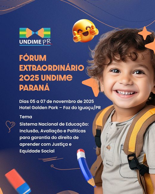 A Undime Paraná promove, de 5 a 7 de novembro de 2025, o Fórum Extraordinário 2025, no Hotel Golden Park, em Foz do Iguaçu/PR. O evento reunirá dirigentes municipais de educação e técnicos das secretarias para dialogar sobre o Sistema Nacional de Educação (SNE) e suas implicações na gestão educacional.