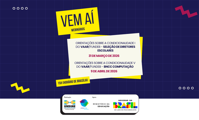 A Undime, em parceria com o Ministério da Educação (MEC), realizará dois webinários para tratar das condicionalidades I (seleção de diretores escolares) e V (BNCC Computação) da complementação VAAR do Fundeb.