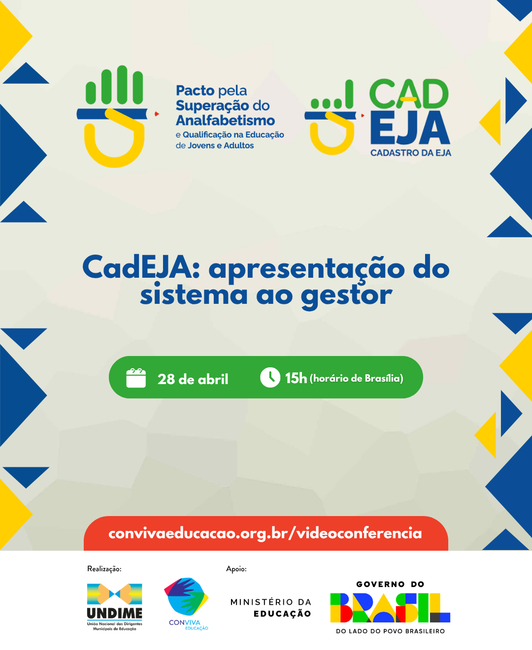 Na próxima terça-feira, dia 28 de abril, a Undime e o Ministério da Educação (MEC) realizarão uma live por meio do canal do Conviva Educação no YouTube para falar sobre o Cadastro da Educação de Jovens e Adultos (CadEJA), uma plataforma do MEC lançada recentemente, que contém informações sobre a oferta e a demanda por matrículas de EJA em todo o território nacional.